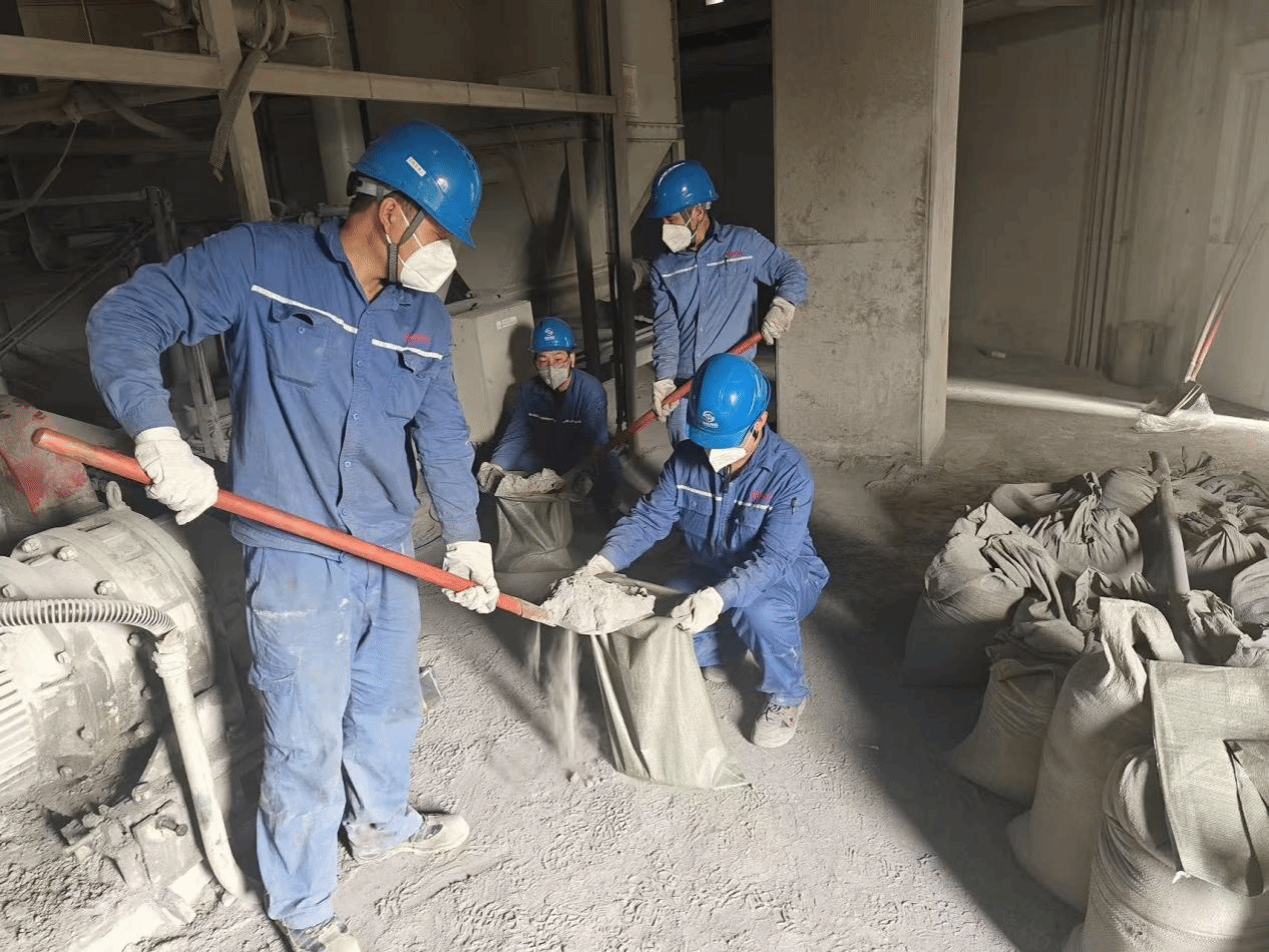 此前,灰库检修平台存在固废长期堆积问题,部分区域板结严重,且作业空间狭窄、粉尘浓度高,对设备巡检造成影响。针对此问题,恒发公司党支部以“检修先锋、岗位建功”品牌创建为基础,组建党员突击队启动专项攻坚。清理过程中,党员骨干全程驻守高粉尘区域,带头处理最坚固的板结块体,多名职工连续作业,在狭窄空间中齐心协力,全身沾满灰渣仍坚持轮班作业,保障清理不间断。队员们面对平台空间狭窄、粉尘大、堆积物板结严重等困难,采用铁锹铲除、榔头破碎、人工装袋、手推车集中转运等接力作业方式,逐片清理死角、清运积料。截至11月3日,灰库检修平台地面恢复整洁,设备巡检通道畅通,现场安全隐患消除。