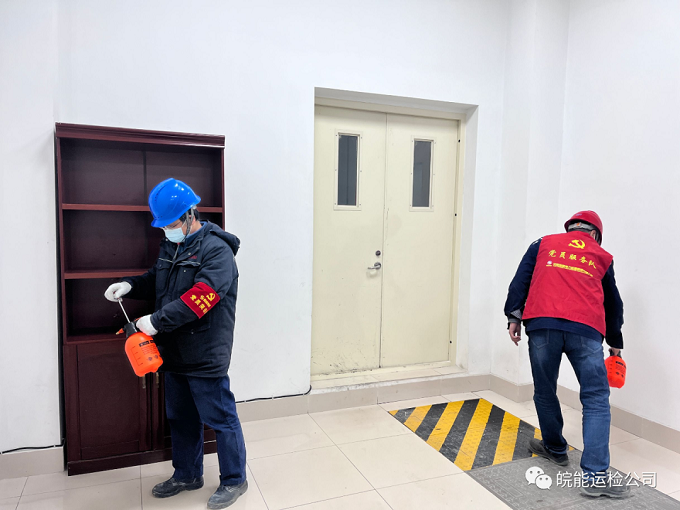 (图为检修事业部党支部党员同志正在开展消杀工作)