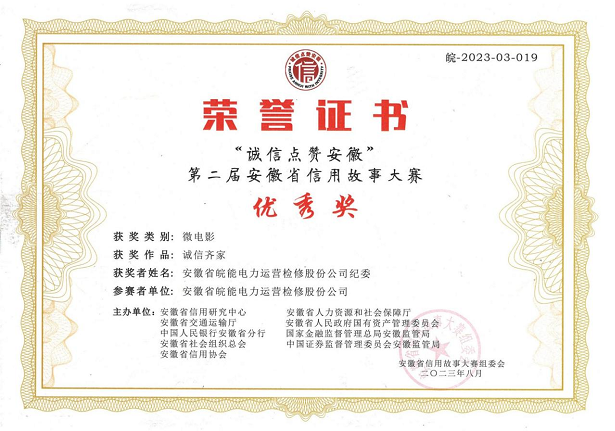 2023年9月7日下午,由安徽省信用研究中心等八家单位联合开展的“诚信点赞安徽”第二届安徽信用故事大赛颁奖仪式在肥举行,由皖能运检股份公司纪委选送的微视频《诚信齐家》获得优秀奖,皖能股份运检公司获得优秀组织奖。