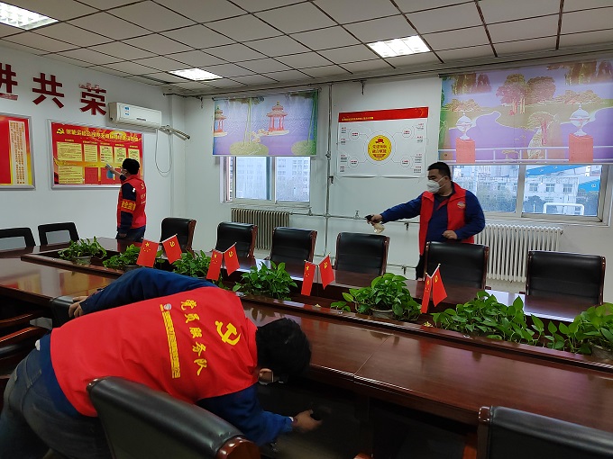 (图为皖能运检临涣项目公司对会议室进行消杀工作)