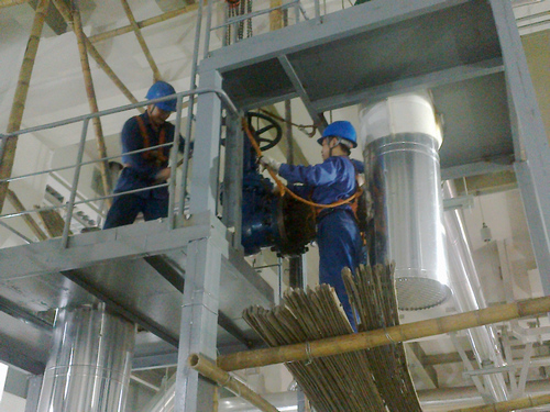 走进#3机组小修现场,检修工作正如火如荼的展开。有序的工器具、整齐摆放的解体设备反映了有条不紊的工作秩序;检修人员精心操作反映了对工作一丝不苟的态度。检修过程中针对#3机循环水、开式水系统各冷却器淤泥堆积结垢严重,技术人员用清洗剂浸泡后再用高压水枪逐个对各冷却器换热片、换热管进行清洗;在更换#3机2号高加至3号高加疏水门时遇到了难题,此阀门通径250mm,重达200公斤,离地面有6m高,阀门上方又无起重吊点,检修作业组发挥全体人员智慧,由主管亲自带人制作专用吊架,克服困难,顺利完成更换工作。