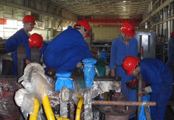 低压对轮,热套式安装,预紧力巨大。经过长时间的运行中周向交变应力的持续作用,对轮和转轴几乎已经融为一体,密不可分。转子一吊出,项目部立即组织人员,将之前做好的重达1.5吨的专用工具安装到位。并安排5名焊工用大烘枪沿对轮周向均匀加热,工作人员准备好螺旋千斤顶、液压千斤顶等工具,在测温仪的显示达到预想中的温差时全力开动,齐头并进。在大烘枪的持续加热下,在施工现场环境温度飙升至摄氏42度的条件下,我们坚持了两个小时,终于走完了短短50公分的对轮行程。这时,所有的工作人员均已汗流浃背,对轮拆下后,工作组长已接近中暑虚脱,几乎是被人架着才离开工作现场。