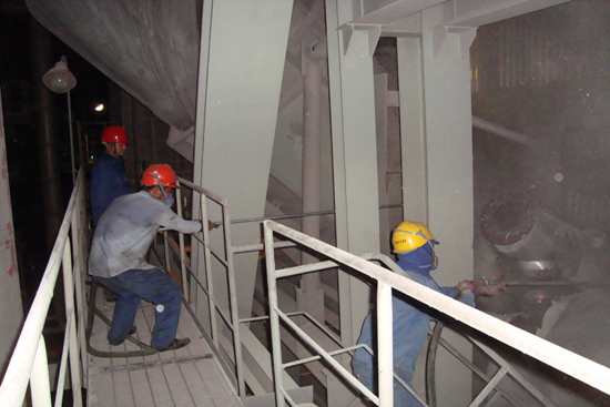 8月21日晚,临焕中利公司项目部#2炉A床前墙二次风管运行中突然断裂,大量红渣外泄,情况十分危急,如不及时处理极有可能酿造成一次停炉事故,临涣中利公司所有的生产记录将会从头再来。在得到中利公司运行史上第一次锅炉压火处理的方案后,皖能马鞍山公司检修项目部锅炉人员在两位经理的精心组织安排下,展开了一场惊心动魄的抢修工作,所有抢修人员冒着有可能被烫伤的危险,在生产现场紧张有序忙碌着。经过短短二个小时与时间赛跑的战斗,皖能马鞍山公司锅炉人员众志诚成,外泄红渣的二次风管得到了及时的封堵,锅炉在第一时间重新带起了负荷,及时有力地挽救了一次发电机组脱网解列的事故,保住中利公司的生产记录,皖能马鞍山公司锅炉检修人员的艰苦付出,不仅再一次地得到了业主的肯定,同时也创造了中利公司锅炉运行史上压火停炉处理事故的先例。(文/图 王建/李正奎)