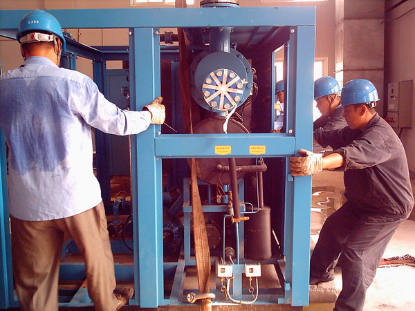机除班班长沈健是此项工程的队长。在现场,同志们用又长又粗的钢丝绳穿过空压机房,分别牢牢拴在零米层的两根水泥柱上,他们用双手、用撬棍,搬运着设备,地面上铺着一根根的钢管,而两台设备“躺在”铺好的钢管上,同志们奋力地拉动拴在水泥柱和设备上的葫芦。管子上的设备一点一点地缓慢行驶着,直到起吊口。冷干机要起吊至十米高的二层楼上,由于起吊井口小,而冷干机大于井口的尺寸,大家群策群力行动起来。他们把冷干机部分设备拆卸下来,再将冷干机倒着起吊,时间一点一点地过去,空压机房的温度也逐渐升高,锅炉公司参战职工的工作热情依然高涨。