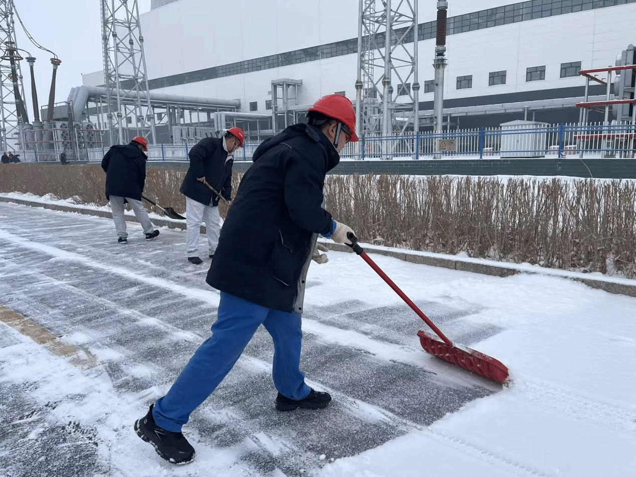 清晨,积雪已覆盖厂区主要干道。各专业管理人员赶到现场进行巡查发现主厂房道路已经结冰湿滑,当即协调各班组成员调整工作安排,组成临时除雪突击队,拿起铁锹、扫帚、推雪板等工具,投入清雪作业。尽管室外气温较低,作业现场却热火朝天。项目部经理与各班组成员一同挥锹铲雪、协同推进,重点清理道路弯道、斜坡及巡检点位周边区域,确保路面见底、防滑到位。经过数小时连续作业,主厂房主干道及周边人行通道的积雪被彻底清除,恢复了安全畅通的状态。