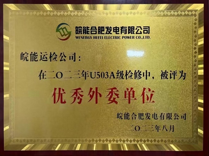 近日,公司荣获业主颁发的“优秀外委单位”荣誉称号,皖能合肥发电有限公司副总经理邵斌到场颁奖。