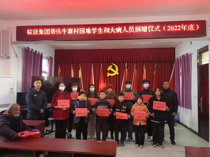 本次捐赠由皖能运检公司、皖能马鞍山公司、新能公司共同出资,其中教育资助3万元,临时救助2万元。牛寨村共有21名困难学生、13名大病困难人员受到资助。