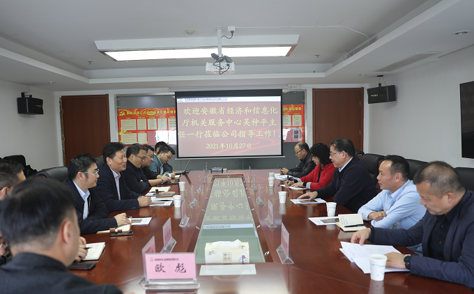 10月27日,皖能运检公司党委书记、董事长张宏在创新大厦会见了安徽省经济和信息化厅机关服务中心主任吴仲平一行,双方就金安大厦综合能源托管服务项目进行深入交流。公司党委委员、总工程师叶茂,安徽皖能节能公司总经理及双方相关单位负责人参加会议。