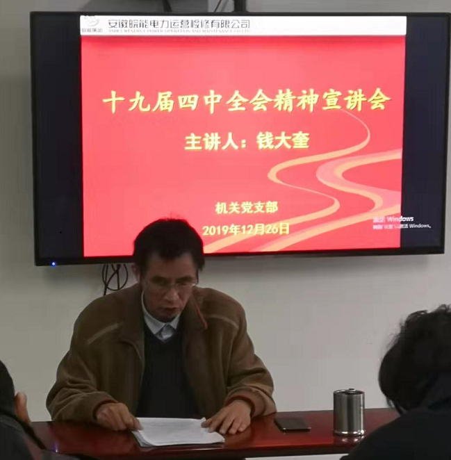 12月26日上午,按照公司党委统一部署,皖能运检公司执行董事、总经理钱大奎在公司机关党支部宣讲党的十九届四中全会精神。