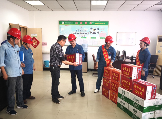 淮北地区骄阳似火,出现了连续多日高温,皖能运检临涣项目公司维护的4台机组“齐上阵”。为打好迎峰度夏攻坚战,鼓足干劲,保障员工人身安全,营造良好和谐的工作氛围,7月18日上午,中利公司党委书记、董事长丁少华到项目公司开展“炎夏送清凉”活动,为项目公司送来了纯净水、方便面等防暑降温物品。