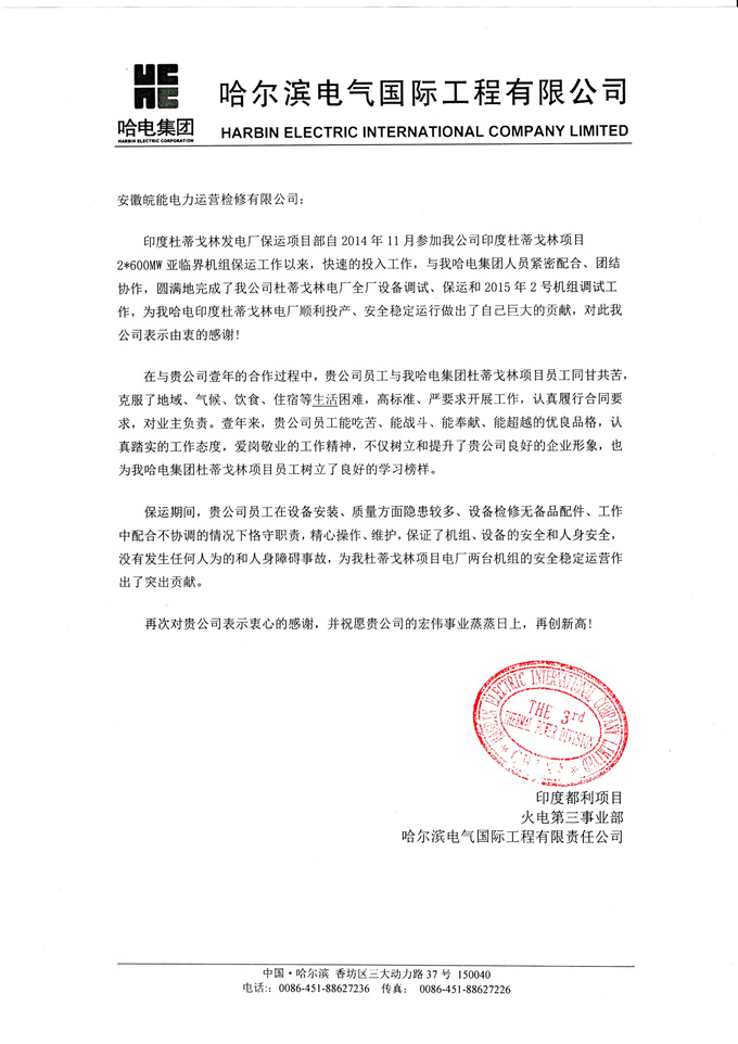 12月2日,哈电集团哈尔滨电气国际工程有限公司发来感谢信,衷心感谢皖能运检公司派往印度杜蒂戈林发电厂技术员工与哈电集团人员紧密配合,为印度杜蒂戈林发电厂2*600MW亚临界机组保运工作做出了突出贡献。并称赞皖能运检公司员工能吃苦、能战斗、能奉献、能超越的优良品格,认真踏实的工作态度和爱岗敬业的工作精神。(王金太)