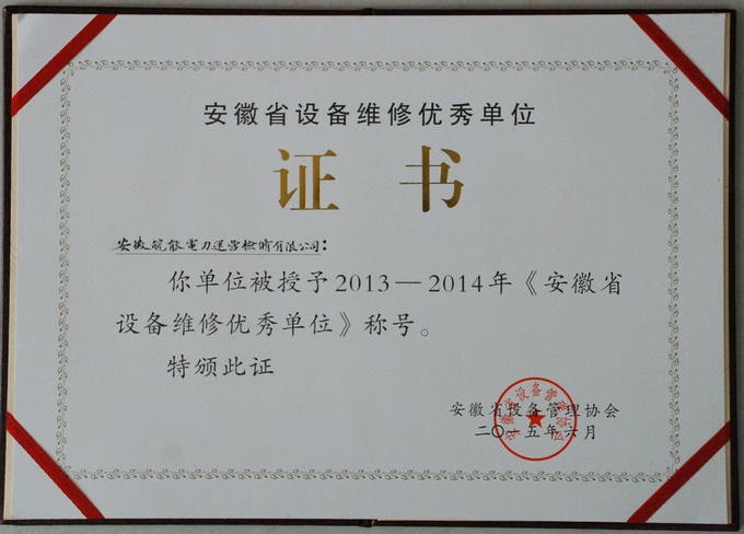 近期,皖能运检公司被安徽省设备管理协会授予2013—2014年《安徽省设备维修优秀单位》和《安徽省设备管理优秀单位》荣誉称号。