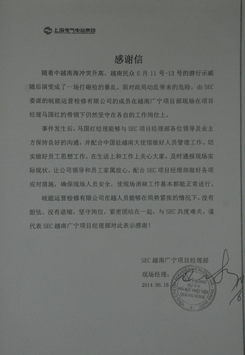 6月23日,皖能运检公司收到一封由上海电气集团SEC越南广宁项目经理部发来的感谢信。感谢信中表达了在中越南海冲突升级,越南民众5月11日至13日的游行示威随后演变成了一场打砸抢的暴乱期间,皖能运检公司广宁项目部员工在马国红经理带领下,主动与SEC越南广宁项目经理部各位领导及越南业主方保持良好沟通,克服困难,不畏危险,坚守岗位,确保了中方在越南投资不受损失的感激之情。皖能运检公司员工良好表现得到了上海电气集团公司高度赞赏,同时也令越南业主方由衷的敬佩。(王金太)