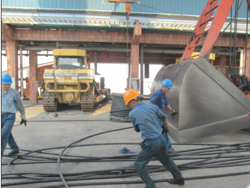 8月12日下午1时,烈日当空,温度达到40度,正在休息室里休息的皖能运检协鑫项目部维护人员,突然接到运行值班员通知,#3号卸船机陆侧开闭钢丝绳发现大面积断丝,项目部立即组织人员去现场查看,发现钢丝绳已有1股完全断裂,情况十分紧急。安全员颜龙和机务班长钱卫伟当即决定对这根断裂的钢丝绳进行更换,此时煤船正在卸煤中,时间的紧迫性可想而知,机务班长带领全班工作人员迅速到达抢修现场,办理工作票、切割钢丝绳、运送新材料、抢修更换、调试,一切紧张有序。汗水浸透了每个人的衣服,如天气一样火热的工作热情和大家明确的分工,让抢修工作在4个小时内完成了任务。