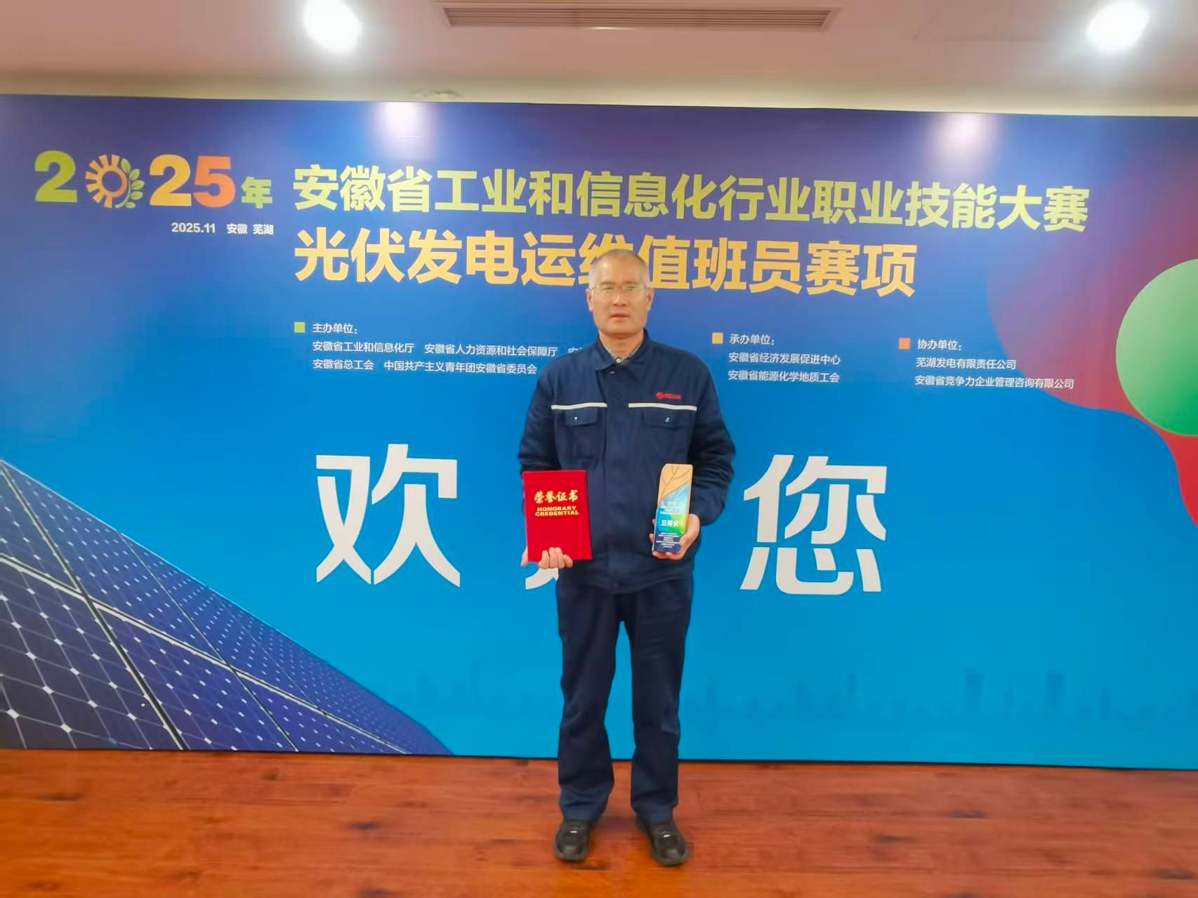 11月16日,2025年安徽省工业和信息化行业职业技能大赛——光伏发电运维值班员赛项在芜湖圆满落幕。公司选手王振水凭借过硬本领荣获光伏发电运维值班员赛项个人三等奖,裁判员童朝平以公正专业的执裁表现获评“优秀裁判员”,双双赢得省级权威认可。