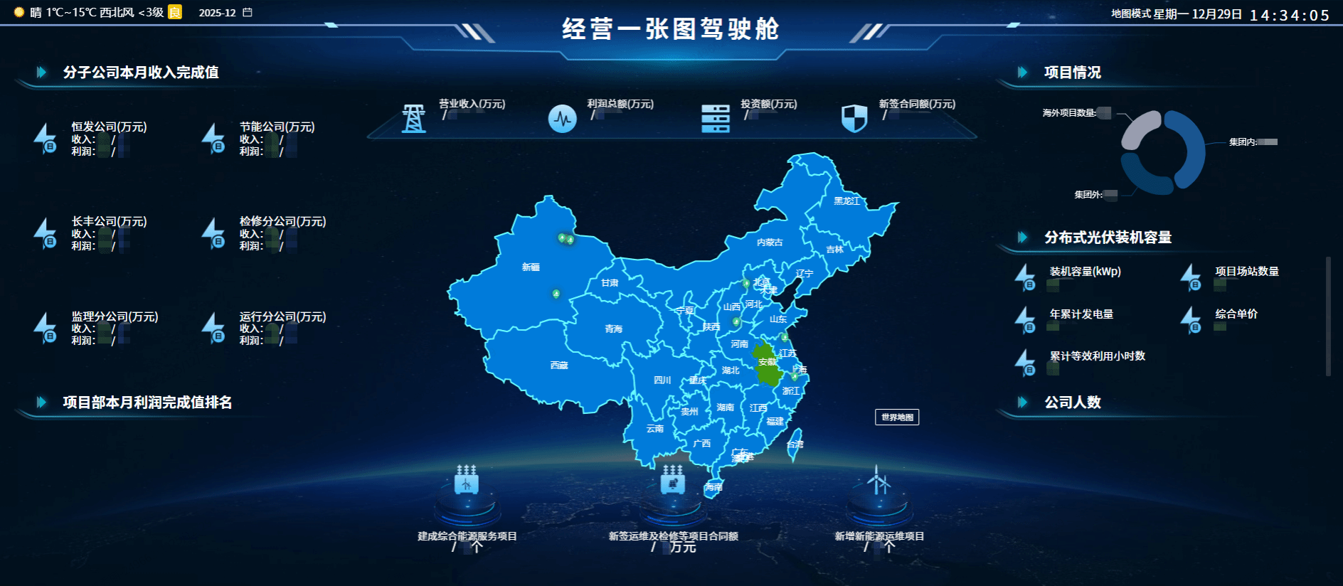 据悉,“经营一张图”是嵌入公司信息管控系统的一个子模块,具备地图与非地图两种展示模式,依托权限分级机制实现数据分层呈现,覆盖企业经营核心指标,精准匹配不同层级管理人员的数据需求。经过将近半年的使用,该模块既可从公司整体视角清晰展示收入、利润等关键数据,也可通过层级穿透功能,聚焦至具体子公司或项目,以柱状图、折线图等形式直观呈现其核心指标、发展趋势与差距分析,为公司各项决策提供了更全面、精准的信息。