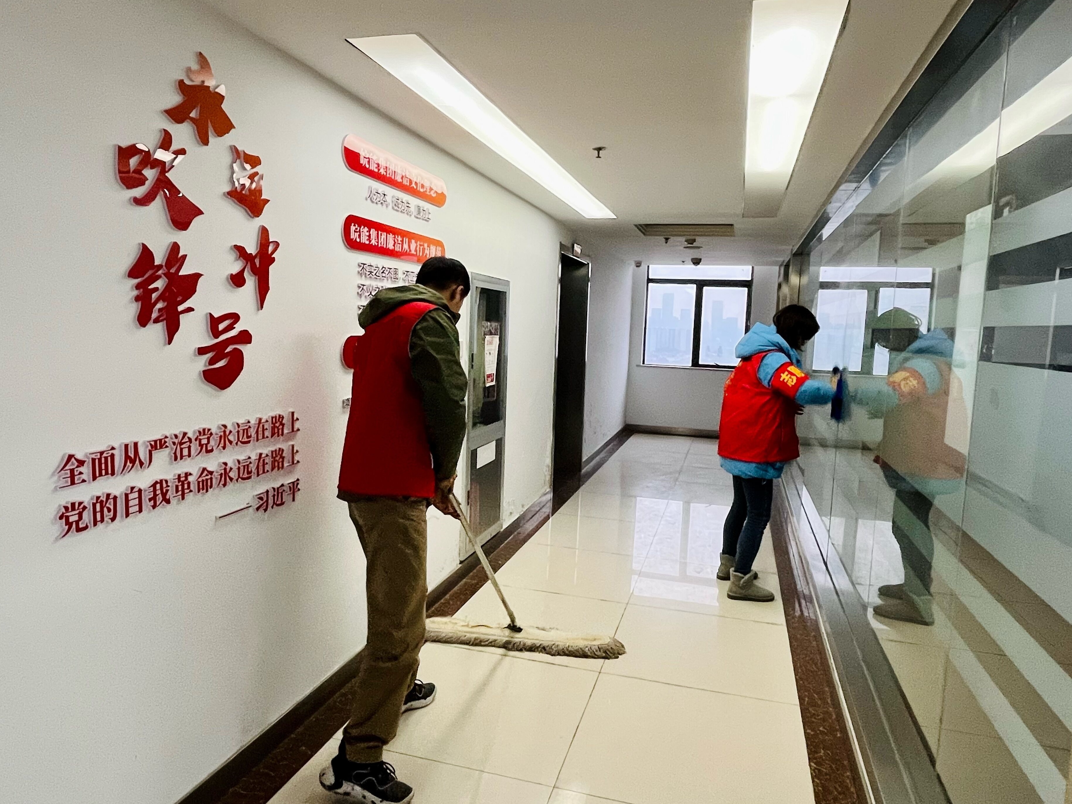 当天上午,恒发公司本部党员和团员青年们于创新大厦14楼集合,兵分两路全面集中治理办公场所的环境卫生。一组拿起拖把抹布,负责擦拭墙角、立体字、玻璃、门上等处的浮尘,针对卫生死角进行深度清理;另一组拿起维修工具,负责对损坏的门锁、桌子进行修缮,整理办公场所,规范张贴禁烟标志等。大家身体力行,热情高涨,不怕苦不怕脏,经过一上午的辛勤劳动,整个办公区域被打扫得干净又整洁。