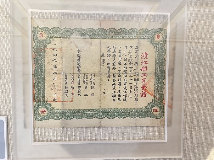 一张1949年的渡江船工光荣证,同样写满历史的痕迹,解放战争时期,安徽作为渡江战役的主要战场,不少船工参与了战役,这张光荣证也是对渡江战役船工英勇行为的肯定。