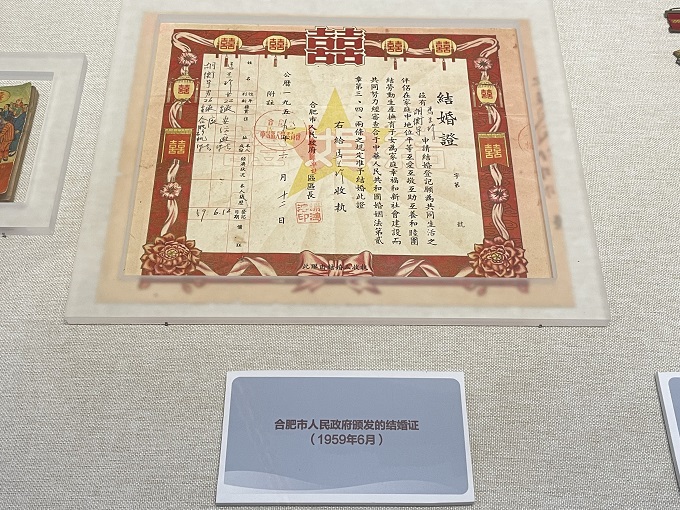新中国成立后,1959年合肥市人民政府发放的结婚证十分喜庆,预示着党领导人民的生活有了保障,百姓的生活发生可喜变化。