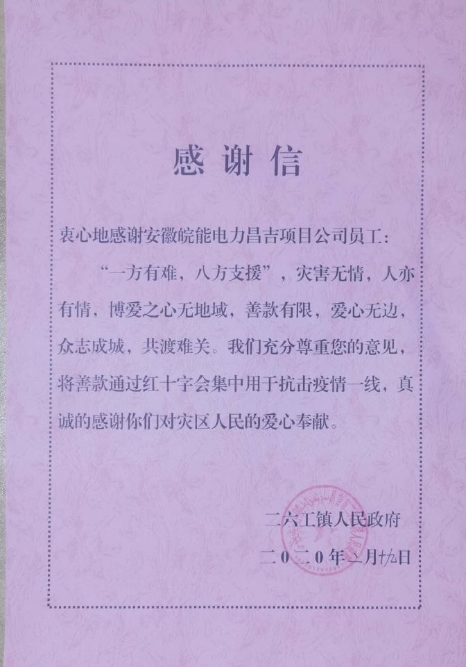 新冠肺炎疫情牵动全国人民的心,2月19日上午,在新疆昌吉项目公司负责人的倡议下,项目部全体员工自发进行爱心捐款,仅半天时间,就筹得爱心捐款16600元!项目部主动联系当地政府,希望把该笔爱心款专项用于抗击新型冠状病毒肺炎疫情,支援抗击疫情工作,为打赢这场“战疫”贡献一份力量。当地政府接到捐款后充分肯定皖能运检昌吉项目公司这一义举,表示将善款通过红十字会集中用于抗击疫情第一线,并致感谢信表示感谢。