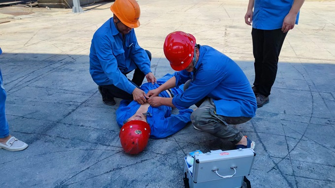 演练当天室外气温高达37℃,参加演练及观摩人员顶着烈日高温进行演练。演练模拟了一名职工现场作业时,因天气酷热和长时间烈日下工作出现头晕、头疼、多汗等症状后晕倒的情景,同组作业人员立即开展紧急救援并将情况及时汇报厂应急管理部门。现场人员将中暑职工转移到阴凉、通风处,解开上衣纽扣,用水轻敷头部、胸部等位置。厂应急部门救护人员携带药箱火速赶到现场,为中暑职工服用防治中暑药品,待到中暑职工身体特征平稳后继续观察。