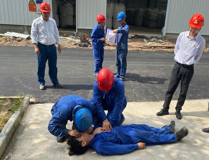 演练模拟了作业人员在渗滤液廊道进行清理作业时,由于通风不畅,导致作业人员在廊道内晕倒的场景。现场作业人员立即将事故情况上报项目部,迅速启动预案开展应急救援。救援人员到达现场,正确佩戴正压式呼吸器,将窒息晕倒人员及时救出,对窒息晕倒人员进行胸外按压急救和人工呼吸,整个施救过程展现出广德环保项目部员工较好的应急救援能力。