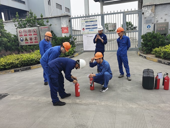 演练前消防运行人员先详细讲解了发生火灾时处理的注意事项及干粉灭火器的正确使用步骤,演练模拟#1机组正在补氢,使用1F氢瓶组,#1C氢瓶组备用,巡检人员在巡检供氢站时发现氢气探测仪报警,#1F氢瓶组出口与管道连接处有氢气泄露,并有蓝色火苗,判断有爆炸可能,立刻汇报班长,并拨打厂内119,班长接到巡检人员氢站着火的报告后立即向当班值长及其二期值长和部门专业领导汇报,值长接到汇报后立即通知启动应急预案,对氢站着火点进行应急处理。