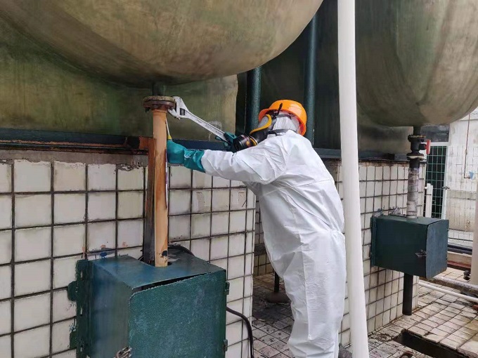 接到汇报,厂领导和安全员及时赶到现场查看情况,与化水班长商讨解决问题方案。经检查,渗漏原因是法兰一颗紧固螺栓锈蚀脱落造成。由于2#酸贮罐内酸存量较多,如果等到罐内酸用完再处理,期间是否会照成更大泄露,大家心里都没有底。化水班长根据现场渗漏情况提出,为消除安全风险,避免发生危化品安全事故,需要立即进行处理。由于厂检修人员没有处理危化品方面的经验,化水班长提出由自己亲自动手解决问题。他穿好防护服,戴上防毒面具和防护手套,在安全员的监护下,拆下锈蚀螺栓,更换上新螺丝进行紧固,消除了安全风险,避免重大事故发生。