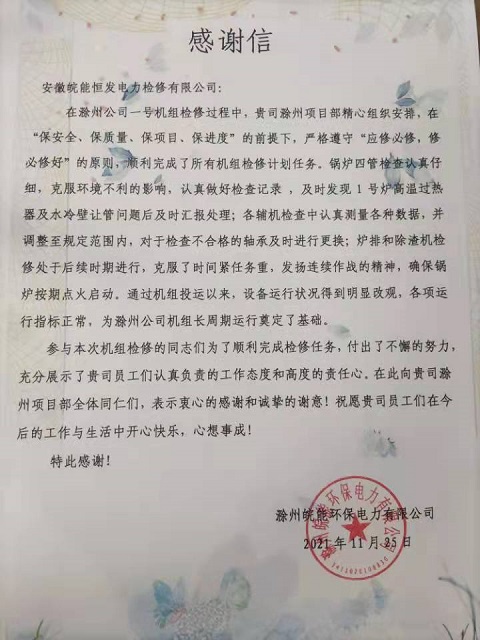 11月27日,皖能运检滁州环保项目部收到业主方发来的一封感谢信。来信不仅充分肯定了项目部本次检修工作,并对参与检修的每一位员工高度的责任心和专业敬业的工作态度给予了高度赞扬。