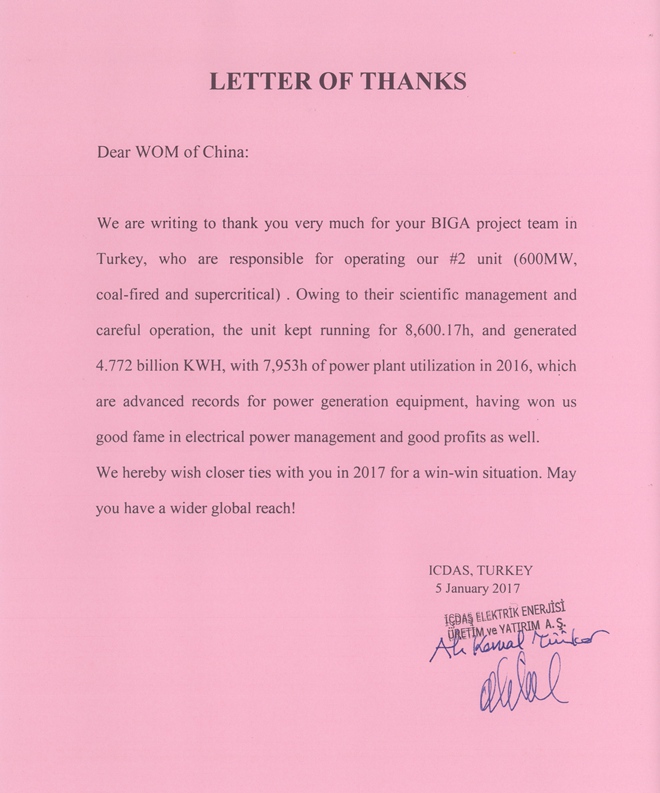 2017年1月5日,皖能运检公司合作伙伴土耳其ICDAS公司发来感谢信,诚挚的感谢了皖能运检公司BIGA项目部运营的#2机组(600MW)在2016年取得的一系列成绩:全年发电47.72亿千瓦时、在网运行8600.17小时,设备利用小时7953.3,此三项成绩不仅在土耳其电力行业创造了同等级机组的新纪录,更是全球范围内中国制造电力设备的绝佳成绩单,实实在在创造了奇迹。