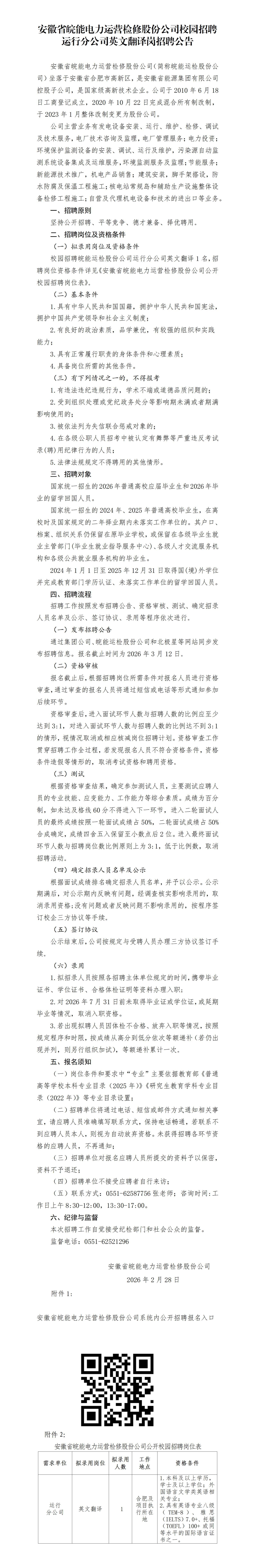 安徽省皖能电力运营检修股份公司校园招聘运行分公司英文翻译岗招聘公告