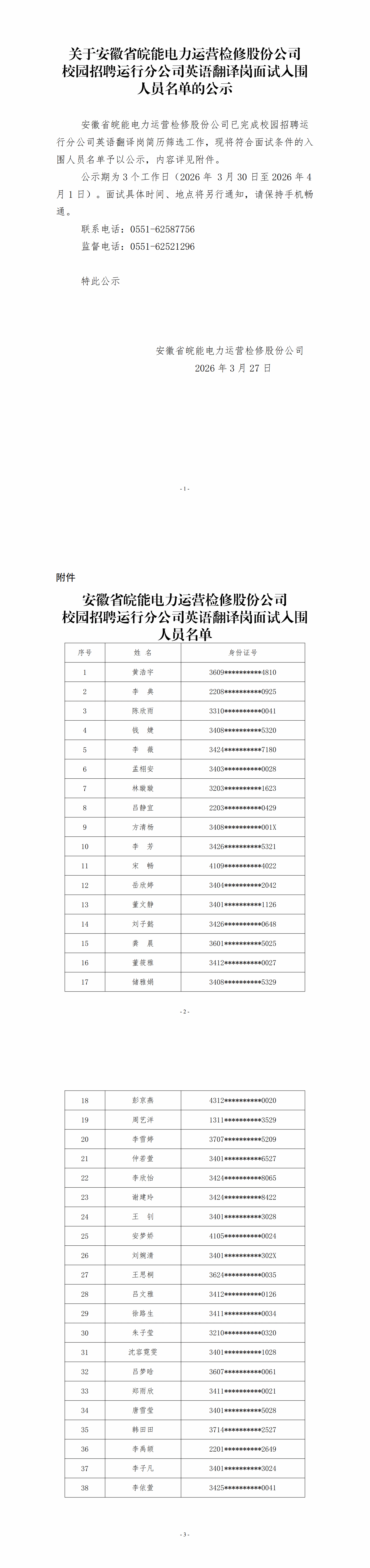 关于安徽省皖能电力运营检修股份公司校园招聘运行分公司英语翻译岗面试入围人员名单的公示