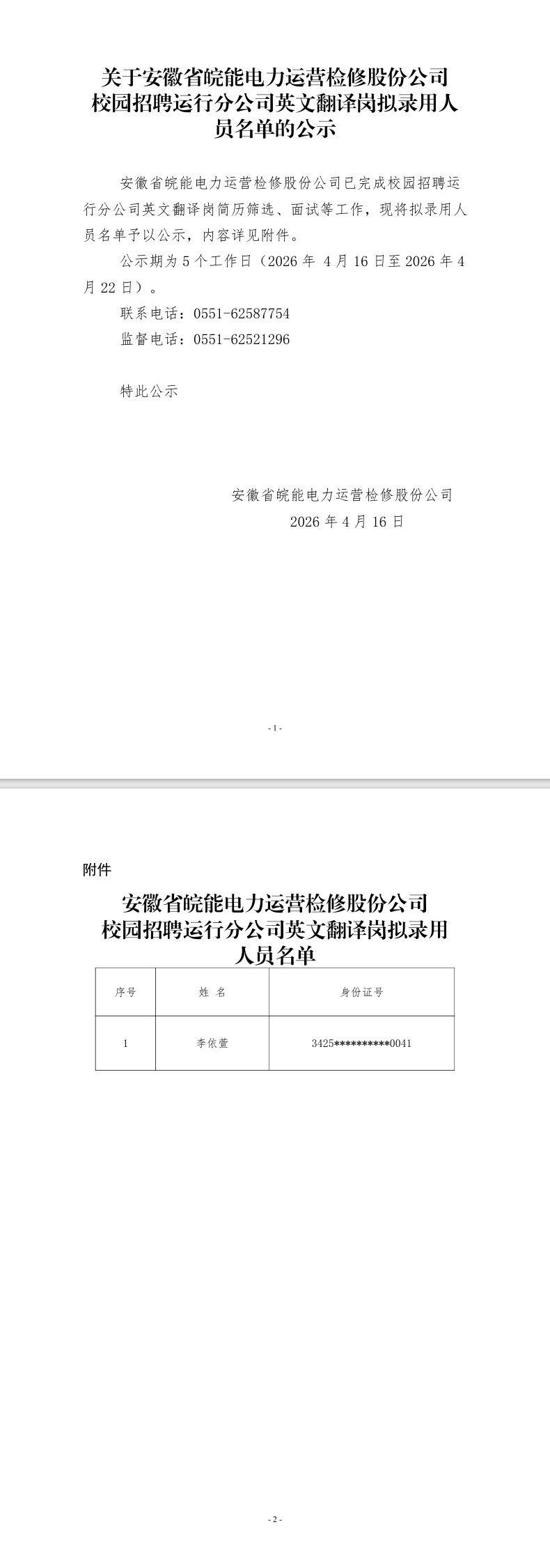 关于安徽省皖能电力运营检修股份公司校园招聘运行分公司英文翻译岗拟录用人员名单的公示