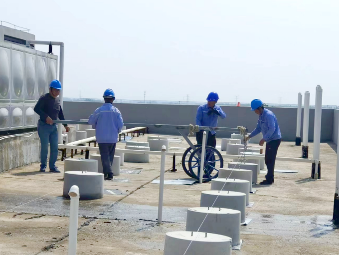 项目主要管理人员坚守一线,全程监护,严格把关施工过程,对吊具、指挥人员资质及吊装环境等逐一检查,确保吊装作业安全进行。在施工中,确保水泥墩吊至屋面后立即用工具车分散开来,避免集中堆放带来安全隐患。1218个水泥支墩,共计6个楼面,全部安全、有序吊装完毕。项目一线工作人员克服困难,抢抓时间,施工期间下起小雨,为了给后续光伏组件安装争取时间,施工人员们穿起雨衣继续作业,汗水与雨水的交融,是奋斗的滋味,每一滴都是项目建设的缩影。