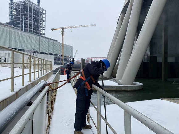 全力以“复”,浴“雪”奋战。项目公司组织精锐力量开展“清积雪、破寒冰”活动,项目各职工坚守岗位,对厂区道路、冷水塔、室外管道等处的积雪进行清扫。针对主干道区域,抛撒融雪剂快速化雪;针对不易清理的路段,用铁锨、扫帚逐步清理。