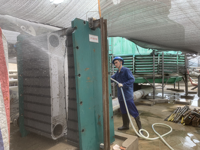 在环保设备运行中,硝化系统的温度控制至关重要,而板式换热器是用于控制硝化系统温度的重要设备,保证其正常运行显得尤为关键。迎峰度夏期间,项目部加大巡检频次,时刻关注该设备运行工况,督促运行人员定期切换设备,对投入备用的板式换热器立即进行清洗、疏通。清洗过程中,项目部检修人员严格遵循清洗操作规程,运用专业清洗剂和精细的操作技能,确保在不破坏硝化细菌的前提下,彻底清除板式换热器上的沉积物和污垢,顺利完成工作任务。