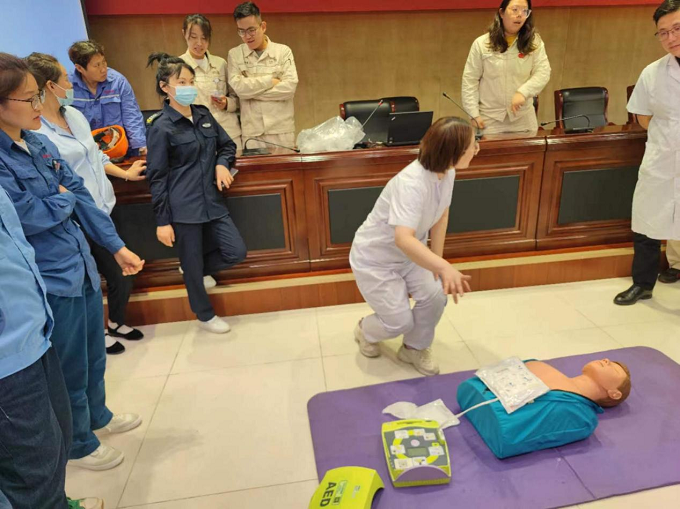 本次培训内容包含中暑后救助方法、心肺复苏、AED除颤仪的使用方法等。在培训中,授课医生通过PPT演示,详细讲解了现场急救步骤、心肺复苏方法、意外伤害的自我保护、救护方法以及急救工具的正确使用方法。参培人员在医护人员指导下,对模拟假人实施心肺复苏术。