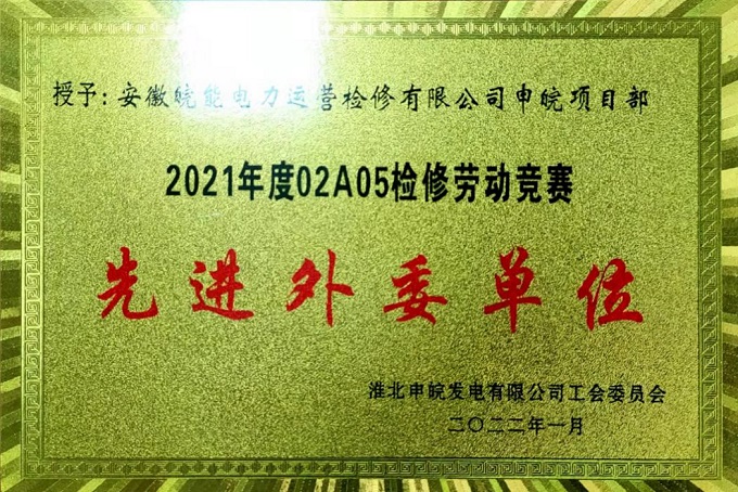 2021年度,在皖能运检公司党委正确领导下,平山项目公司全体员工共同努力,践行“绿色检修、诚信服务”的宗旨,安全、高效、优质地完成了02A05检修工作,得到了业主方的高度评价及赞誉,荣获淮北申皖发电有限公司颁发的2021年度02A05检修劳动竞赛“先进外委单位”荣誉称号。