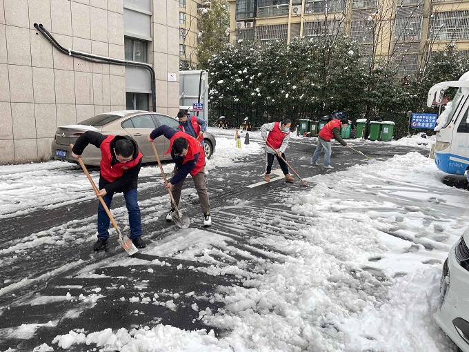 天寒地冻挡不住大家的热情,清扫积雪的场面热火朝天。党员服务队的同志们挥动铁掀,分工协作、相互配合,对办公楼附近道路以及停车场入口的积雪进行清扫,将清扫的积雪统一堆放在合适区域,并对部分积雪融化后造成的道路积水进行清理。经过大家的共同努力,不一会路面积雪就被清理干净,有效保障了办公园区内人员的出行安全。此次志愿活动进一步推动“我为群众办实事”主题实践活动走深走实,机关党支部志愿服务队带头奉献、服务大家,用实际行动践行了初心使命,展现了责任和担当。(马登辉)