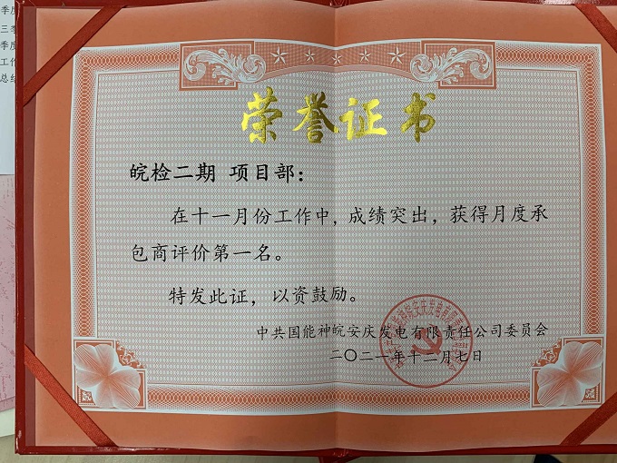 皖能运检安庆项目部(二期)获得业主单位月度“优秀承包商”荣誉
