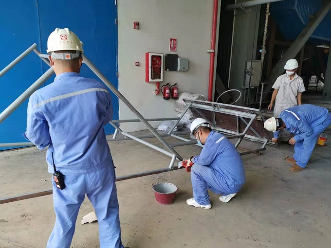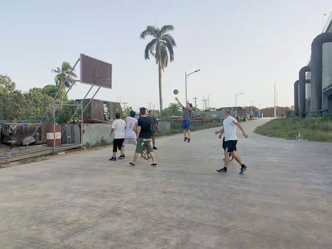 为制作篮球架,项目部协调上海电气,就地取材进行制作,大家踊跃参与、出谋划策,从下料到焊接、再到刷漆防腐,齐心协力,克服条件限制,终于高质量、高标准的完成了篮球架的制作。现在每天晚饭后,员工都可以打打篮球,运动既愉悦了身心,又增强了体质,同时也增进了项目部员工之间的感情和团结凝聚力。