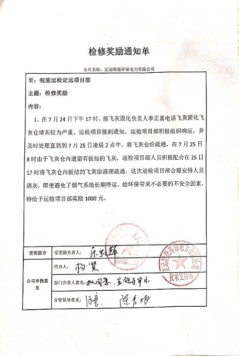 7月24日17时,定远皖能环保发电公司运行人员发现飞灰固仓堵灰严重,经检修人员打开人孔门检查,发现飞灰仓内有遗留的板结飞灰块,项目部立即组织人员进行板结飞灰块清理疏通,经过8小时的持续清理终于完成了飞灰的疏通工作,并积极配合业主方清理运送飞灰,于7月25日17时彻底将飞灰块清理完成。
