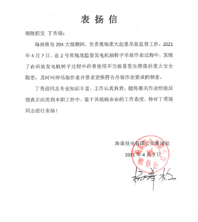 为此,业主方对我公司现场大修工作的开展表示高度的认可,同时也给予丁秀迎同志下发了表扬信!(海南昌江核电项目部)