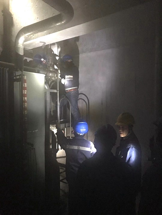 2月19日21点左右,皖能运检国安项目部化水班接到通知:采暖加热站4.5米补水箱补水门出现故障无法关闭造成补水箱大量进水溢流。险情紧急,班长迅速组织人员赶往现场查看。因补水门无法关闭,导致补水箱持续补水,水箱内水满外溢,溢出的水顺着采暖间地面、楼道流出,而零米就是#1机6KV开关配电室,如果水进入到开关配电室,后果将不堪设想,抢修工作迫在眉睫。