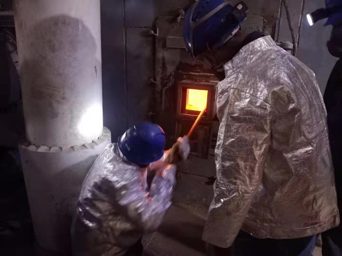 2020年12月29日16:10,皖能运检芜湖环保项目部接到运行值班人员通知#2炉燃烬段炉排上有焦块,项目部人员立即赶到现场查看情况,发现#2炉B侧燃烬段炉排上有约2.5×1.5×1米的焦块。项目经理亲自布置清焦工作,安排工作负责人办理工作票,工作班成员准备捣焦工具、防烫服、防烫手套、护目镜等,机务班长联系运行调整燃烧、保持炉膛负压、停运燃烬炉排等措施。运行人员到现场配合。当一切准备工作就绪后,在项目部经理和安全员的旁站监督下,#2炉清焦工作开始。工作人员穿戴齐全,拆开观火孔,仔细观察焦块情况后,采取技术手段,两人一组用钢钎进行破碎,钢钎插不进去,就用大锤敲打。