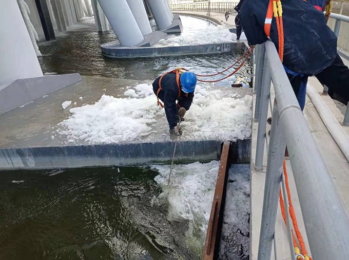 近日,天气温度骤降,板集电厂1、2号凉水塔底部大量结冰,部分冰块在水力冲击下,落入凉水塔底部水池内,并被冲集到水槽拦污栅处聚集,造成凉水塔底部水槽流水不畅,水位下降,差压升高,存在极大的机组跳停风险,给发电机组迎峰度冬期间的安全稳定运行带来十分不利的影响。