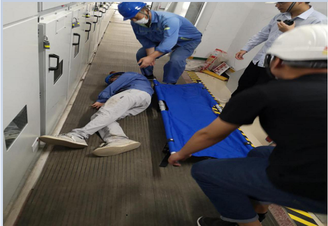 本次触电事故现场模拟了一名员工在高低压配电室内,不小心触电昏倒。周边同事发现触电人员后,立即断开电源并向负责人汇报现场情况,同时拨打求救电话,做好现场紧急救护工作。