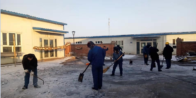 新疆五彩湾气温低至零下16度,连日来的雨雪天气再加上生活区暖气循环水泵轴封漏水造成的小院地面大片结冰,地面行走易滑是最大的安全隐患。五彩湾项目部输煤运行一班利用倒班休息,在班长王云岭的带领下,积极投入到热火朝天的除冰志愿者行动中,有的拿铁锹,有的拿扫帚,有的拿撬棍,为了对付厚厚的积冰更是借来了电镐,地面上的多层冰,一层一层的清理。脸虽冻紫,手也冻麻,但心里火热。经过一上午的努力,生活区的地面积冰终于清理干净,确保了员工出行安全、顺畅。(刘西强)