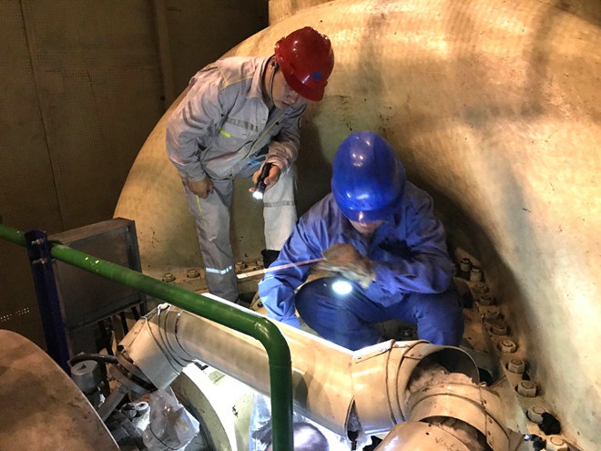 检修工作正式开始后,项目公司总经理白锡明,副总经理江浩亲自到化学专业B盐酸储罐排污一次门阀体检修现场进行现场指挥,并参与抢修工作,有效鼓舞了参加检修人员的工作干劲。经过近4个小时的紧张抢修, B盐酸储罐排污一次门阀体砂眼堵漏工作在安全状态下圆满完成;而汽机专业人员在专业主管赵德建的监督监护下,由于现场设备管道复杂、作业位置空间狭小,作业环境温度高,焊接位置不便、工作难度大等多种不利因素,通过十余小时的连续奋战, #1机16.5米A气泵驱动端机封水法兰漏水处理工作得到了消除。(任振东)
