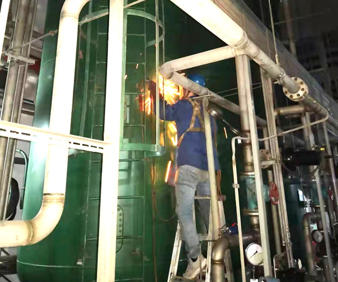 化学专业技术人员精心做好准备,安排技术精湛的高压焊工赵红伟于当天16:30开始对罐体漏点进行补焊。由于对罐体外部漏点进行补焊的同时,还要对罐体内部进行涂抹衬胶处理,存在属于受限空间作业,且罐体内部衬胶属于易燃物,极有可能在补焊过程中发生火灾事故。为保证该项工作在不发生危险状态和不影响整体设备正常运行的情况下,在电厂限定时间内顺利完成该项工作,项目公司管理人员始终在现场指导,专职安全员全程进行安全监督监护工作。连续奋战四个半小时,于当天21:00全面完成漏点补焊和内部衬胶涂抹工作,并经业主单位设备管理部门技术人员验收合格,期间电厂夜间值班领导到现场查看工作进度和工作质量,对相关情况表示十分满意。(文/图 任振东 吕文华)